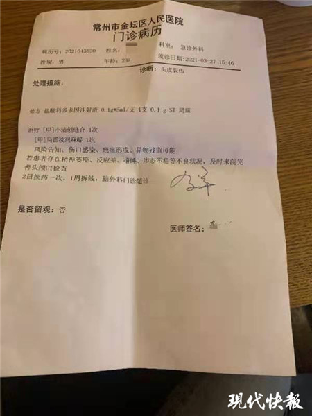 “找到景區(qū)工作人員后,我把孩子帶到醫(yī)務室,沒想到的是竟然是保安幫著處理傷口,這么大的景區(qū)難道連個有資質(zhì)的醫(yī)務人員都沒有嗎?更讓我生氣的是,我要求帶孩子去醫(yī)院,一名工作人員居然笑著對我說,去醫(yī)院的話會不會開車把她送回來。”余先生氣憤地告訴現(xiàn)代快報記者,到了金壇區(qū)人民醫(yī)院,景區(qū)工作人員沒有主動幫忙掛號帶孩子就診,而是丟了一句“該走保險走保險,要處理回景區(qū)處理”的話后,就直接離開了。