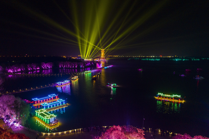 與往年相比,今年,姜堰充分挖掘水資源,致力拉長旅游產(chǎn)業(yè)鏈,大手筆新增溱湖水上游線夜游演藝項目,全力發(fā)展夜游、夜娛、夜演等旅游“新”形式,讓河湖“流光溢彩”“流金淌銀”,實現(xiàn)白天一景、夜晚一夢的旅游新模式,打造“白+黑”“5+2”的旅游新極點。 4月7日晚,“一夢到溱湖”水上行進(jìn)式燈光秀開啟首秀,姜堰的民俗、非遺、傳說、會船文化等,在五光十色中繽紛呈現(xiàn)。游客們乘坐水上巴士,夜枕一湖明月,坐賞槳聲燈影,親身體驗一個別樣的溱湖濕地。