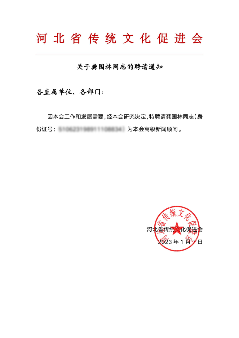 近日,因河北省傳統(tǒng)文化促進(jìn)會(huì)工作和發(fā)展需要,經(jīng)協(xié)會(huì)研究決定,特聘請(qǐng)龔國(guó)林同志為本會(huì)高級(jí)新聞?lì)檰?wèn)。