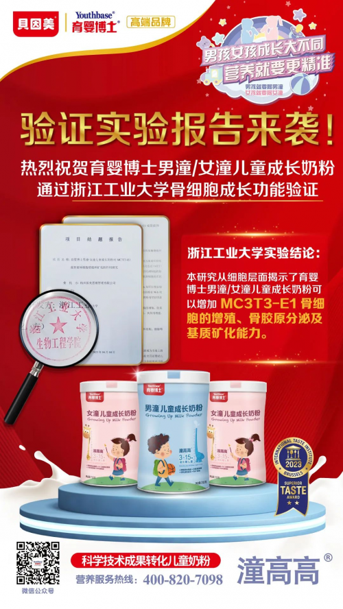 育嬰博士男潼女潼兒童奶粉通過浙江工業(yè)大學骨細胞成長功能驗證!科學營養(yǎng),助力長高