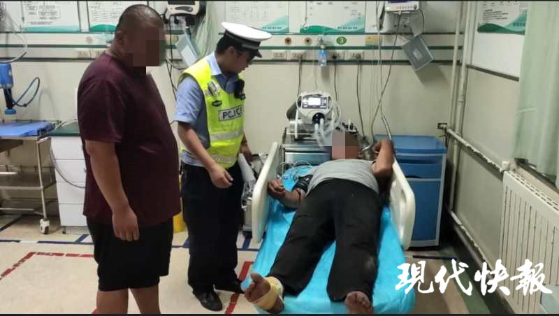 當(dāng)天上午11點半左右,徐州交警治安卡口大隊火花檢查站民警在路上執(zhí)勤時,突然有一輛灰色轎車停在他們跟前,司機下車向他們呼救,稱自己岳父被除草機割傷了,希望交警幫助開道送醫(yī)。