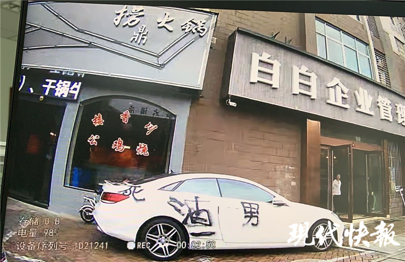 現(xiàn)代快報(bào)記者了解到,7月23日,男子小李將私家車停在一火鍋店門口,可當(dāng)他回來(lái)取車時(shí)發(fā)現(xiàn),車上竟然被噴了黑油漆,寫著“渣男”“劈腿”等字樣。走近一看,車身上還被多處刮傷。小李趕忙報(bào)了警。蘭陵派出所民警接到報(bào)警后立即趕往現(xiàn)場(chǎng),調(diào)取了街邊的公共視頻看到,劃車、涂鴉的是一個(gè)年輕女子。