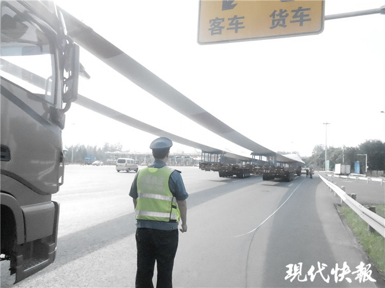 (通訊員 寧交執(zhí) 記者 李娜)8月11日下午3點多,在南京大勝關大橋主線收費站附近,3輛遼B牌照、車貨總長均達68米的“巨無霸”貨車排成一條“巨型長龍”躊躇不前,場面頗為壯觀。