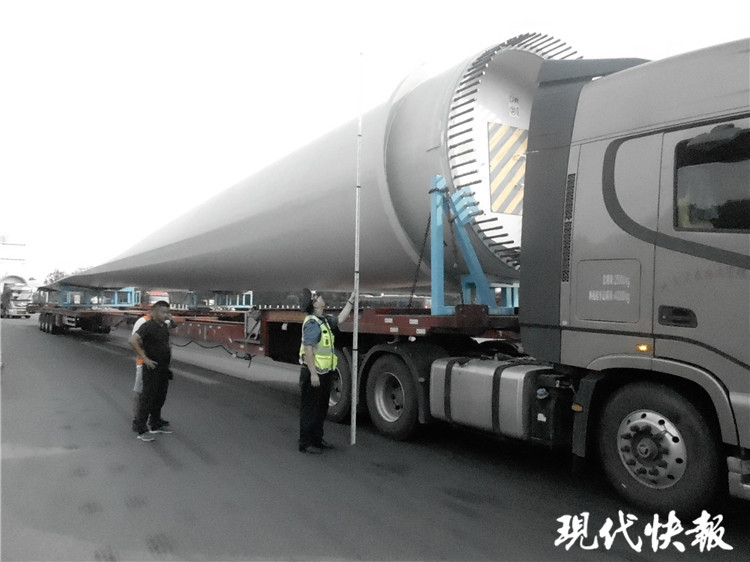這是遇上什么困難了嗎?正在附近巡查的南京市交通運輸綜合行政執(zhí)法監(jiān)督局三支隊執(zhí)法人員主動上前詢問。原來,這3輛車同屬某物流公司,此次從連云港運送風電葉片至廣西,已按要求辦理了《超限運輸車輛通行證》。因半途走錯路,應該走南京棲霞山大橋的車隊卻上了大勝關大橋,前方下高速的匝道也無法滿足車輛的轉彎半徑要求,車隊一時間陷入進退兩難的境地。