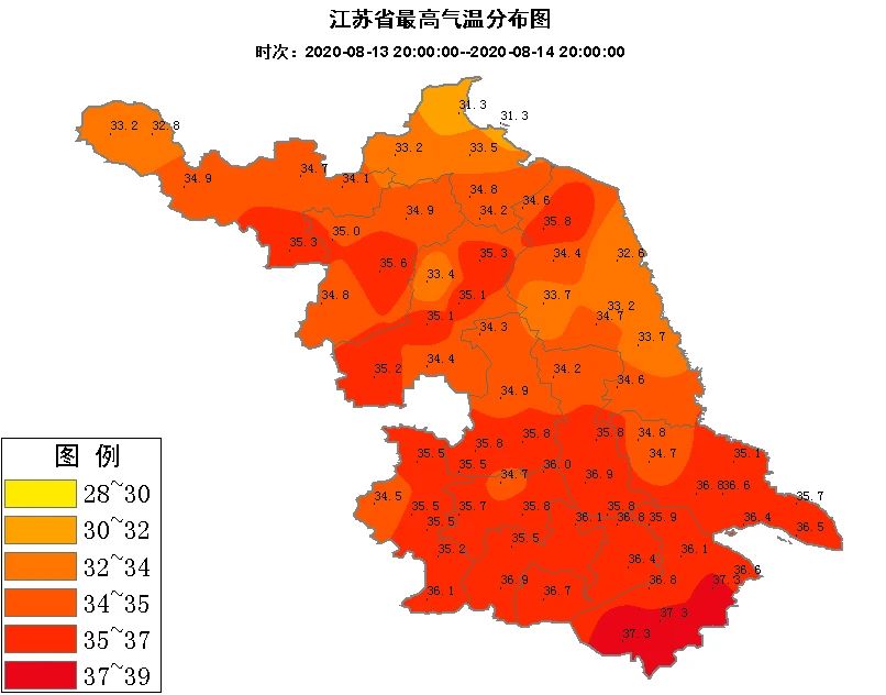 每天出門,戶外都是熟悉的“燒烤”氣息。8月14日,江蘇高溫線以上區(qū)域進一步擴大。全省37℃+以上的地方有3個,昆山、吳江、東山并列37.3℃。36℃+以上的有15個、35℃+的有24個,其他地區(qū)也紛紛向高溫線靠近。與13日相比,沿江蘇南地區(qū)基本升至35℃以上,高溫區(qū)占了全省一半。江蘇省氣象臺也繼續(xù)發(fā)布高溫橙色預警信號,全省基本被高溫預警包圍,蘇州、南通、無錫普遍發(fā)布高溫橙色預警。
