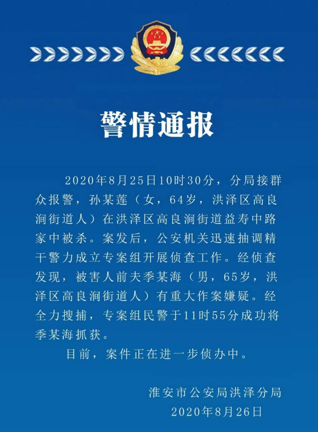 (記者 李子璇)8月26日,淮安市公安局洪澤分局發(fā)布警情通報(bào),25日接群眾報(bào)警稱(chēng),孫某蓮(女, 64歲,洪澤區(qū)高良澗街道人)在淮安市洪澤區(qū)高良澗街道益壽中路家中被殺。