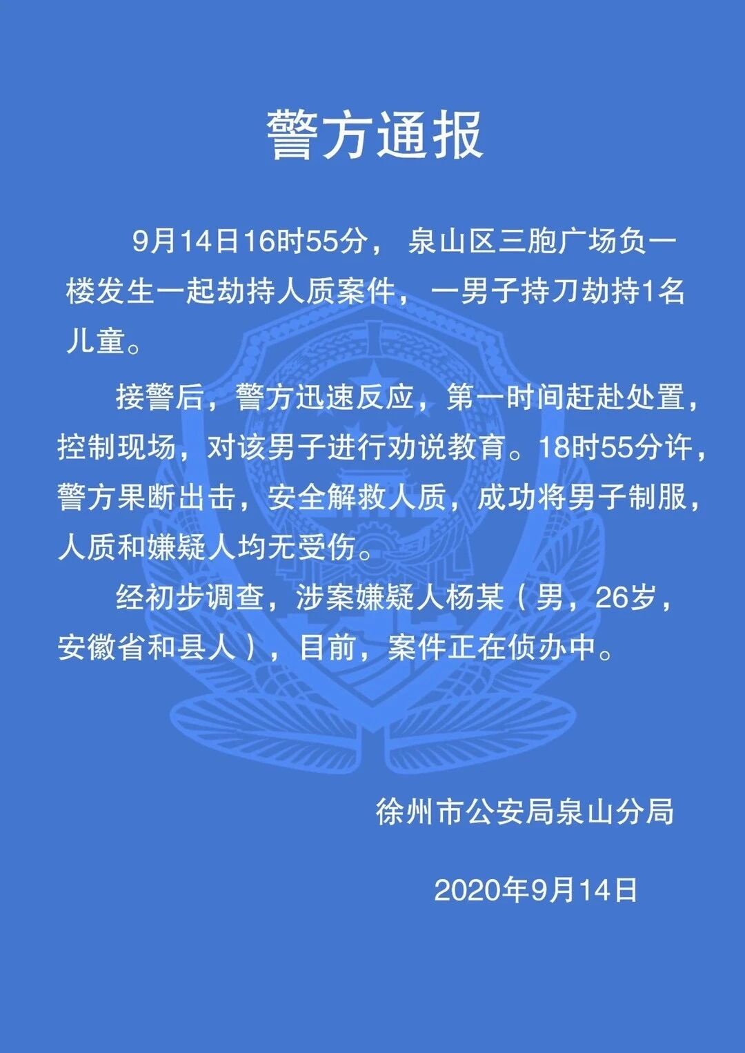 (記者 張曉培)9月14日16時55分,徐州市泉山區(qū)三胞廣場負(fù)一樓發(fā)生一起劫持人質(zhì)案件,一男子持刀劫持1名兒童。