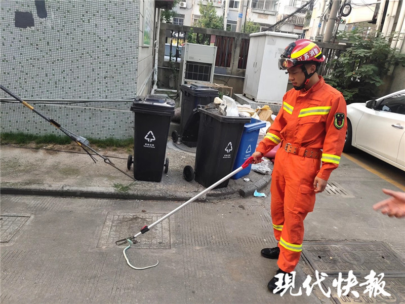 9月25日下午,揚(yáng)州開發(fā)區(qū)的周奶奶發(fā)現(xiàn)家里房門后有一條蛇,嚇得她趕緊撥打了消防隊(duì)的電話求助。接到周奶奶的求助后,特勤中隊(duì)的方榮信和隊(duì)友們趕到了周奶奶家中。“家在四樓,當(dāng)時(shí)老奶奶感覺被嚇得不輕。”方榮信告訴現(xiàn)代快報(bào)記者,他和隊(duì)友們穿好防護(hù)用具后,就進(jìn)入了房間。