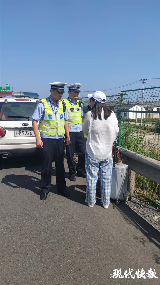 當(dāng)日上午10時(shí)38分左右,揚(yáng)州交警高速二大隊(duì)民警劉磊和張征巡邏至京滬高速往北京方向903公里處時(shí),看到一名年輕女子站在護(hù)欄邊不停地向警車揮手,民警趕緊停車了解情況。