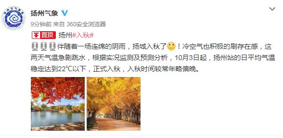 (記者 顧瀟)10月4日,揚(yáng)州氣象微博發(fā)布稱,10月3日揚(yáng)州正式入秋,入秋時(shí)間比往年稍晚。