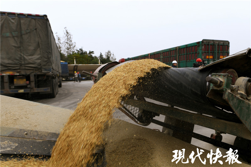 剛進入糧庫區(qū)域,現(xiàn)代快報記者看到幾輛大貨車正在卸糧食,稻谷經(jīng)過傳送帶和兩道過篩的工序,然后運送到最近的一間糧庫內(nèi)。工作人員介紹,正在卸貨的大貨車裝載了19噸稻谷,都是來自淮安運過來的秋糧。卸貨過程中,有稻谷散落在地上,工人會及時清掃然后再次過篩,保證送來的糧食都顆粒歸倉。