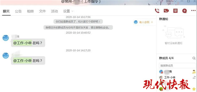 現(xiàn)代快報記者從武進(jìn)警方了解到,10月14日上午,申女士被拉入一個QQ聊天群,群里還有公司的老板、總經(jīng)理,監(jiān)事。這個聊天群主要談?wù)摴镜娜粘I(yè)務(wù),其余三個人對公司的運(yùn)營狀況非常了解,“總經(jīng)理”還時不時要求申女士核對大額轉(zhuǎn)賬的情況。