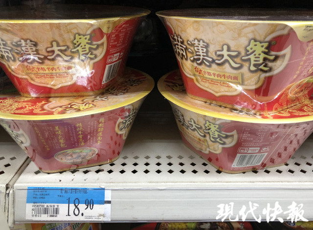 在新街口另外一家大型綜合超市,貨架上主要是傳統(tǒng)方便面,單價(jià)多在5元左右。其中只有兩款方便面價(jià)格較貴,有一款是康師傅的,一盒20元,重量246g;另一款統(tǒng)一方便面,重量180g,價(jià)格為18.9元。這兩款都是油炸方便面,大肉塊、高湯包是宣傳的重點(diǎn)。超市導(dǎo)購(gòu)員告訴現(xiàn)代快報(bào)記者,由于價(jià)格比較高,這兩款方便面銷量一般。