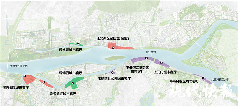 今年,《南京魅力濱江2035》出爐,提出要打造9大濱江城市客廳,如今這些客廳建設(shè)進(jìn)展如何?南京市規(guī)劃和自然資源局城市設(shè)計(jì)處吳欣鑫介紹,南京的九大客廳各有定位。河西魚嘴城市客廳:將“青春揚(yáng)子江”與江豚主題相結(jié)合,建設(shè)江豚互動(dòng)廣場(chǎng)和活力運(yùn)動(dòng)水岸,打造南京國(guó)際形象和生態(tài)文明相融合的重要窗口。歡樂濱江城市客廳:打造集觀景、演出、休閑、游憩等多功能的濱江活動(dòng)廣場(chǎng),是交流和娛樂的歡樂舞臺(tái)。綠博園城市客廳:以綠博園為生態(tài)背景,強(qiáng)化河西文體軸與濱江的聯(lián)系,與江蘇大劇院聯(lián)動(dòng)打造生態(tài)、綠色、活力的時(shí)尚文化客廳。寶船遺址公園客廳:集合寶船文化遺產(chǎn)、濱江公園、渡江勝利紀(jì)念碑和紀(jì)念館資源,打造國(guó)家級(jí)航海文化和紅色文化展示平臺(tái)。下關(guān)濱江商務(wù)區(qū)客廳:強(qiáng)調(diào)對(duì)近代歷史記憶的表達(dá),建設(shè)近1公里的二層平臺(tái),連接中山碼頭、大馬路、老江口等文化遺產(chǎn),重現(xiàn)20世紀(jì)初下關(guān)商埠風(fēng)貌。上元門城市客廳:挖掘達(dá)摩“一葦渡江”的傳說和金陵船廠工業(yè)遺產(chǎn),形成歷史特色鮮明的創(chuàng)意園區(qū)。幕燕城市客廳:重現(xiàn)“燕磯夕照、永濟(jì)江流”等金陵經(jīng)典盛景,依托山水人文資源,打造宜居宜游的城市客廳典范。江北新區(qū)定山城市客廳:依托江北核心區(qū)資源,建設(shè)形成新區(qū)最重要的新城門戶、智慧客廳。綠水灣城市客廳:結(jié)合江北青奧體育公園,打造縱覽大江景色的濕地游園和弘揚(yáng)青奧精神的生態(tài)客廳。