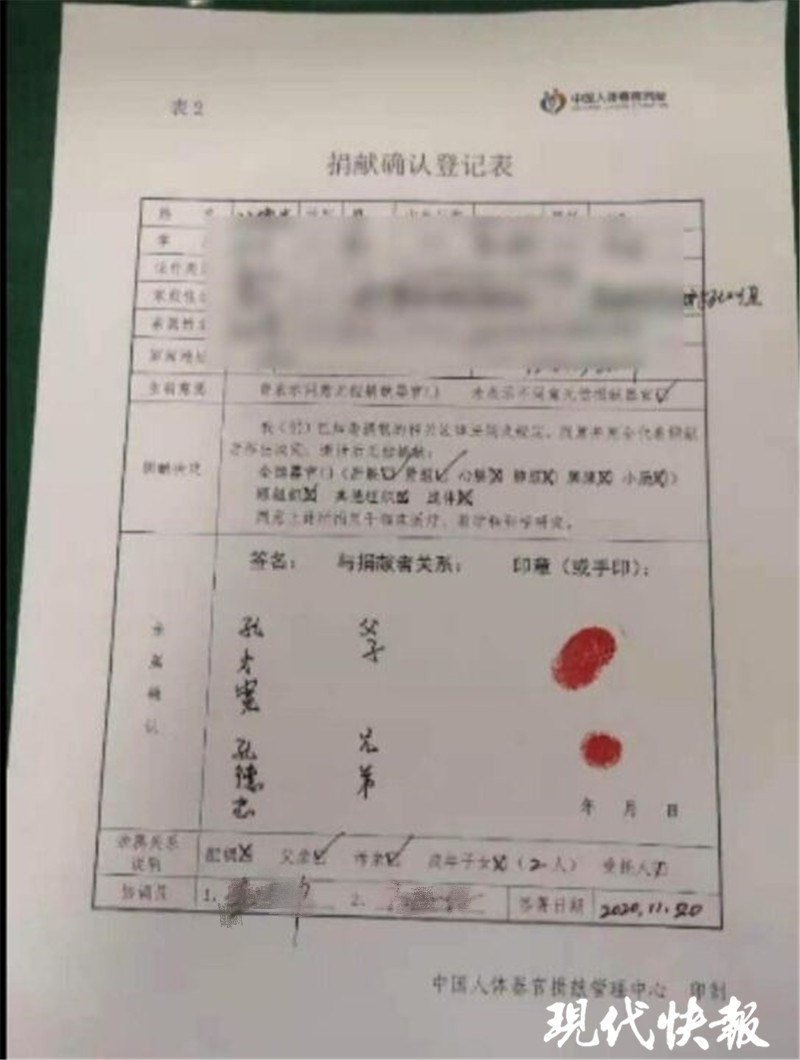 11月20日下午,孔德選的爸爸和哥哥在人體器官捐獻(xiàn)確認(rèn)登記表上,替孔德選簽下了姓名,按下了手印。隨后便進(jìn)行了器官捐獻(xiàn)手術(shù)。