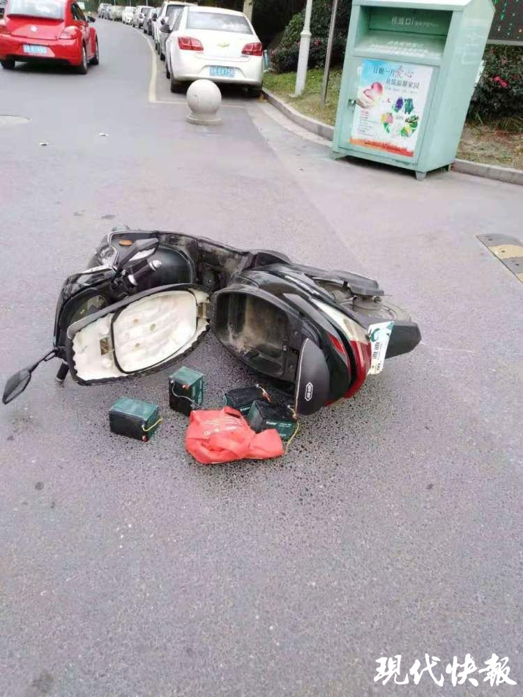 現(xiàn)代快報記者從視頻中看到,偷車賊一開始是準(zhǔn)備從小區(qū)門崗的非機(jī)動車小門騎車出去,但距離門崗幾米后,他又騎車折回。不到一分鐘,一輛轎車從門崗機(jī)動車道駛出,攔道器抬起,轎車出門后,嫌疑人加快速度,以為能從抬起的攔道器下沖出門,結(jié)果正巧攔道器落下,他撞了個正著,連人帶車摔在了地上,頭盔等物品散落一地。