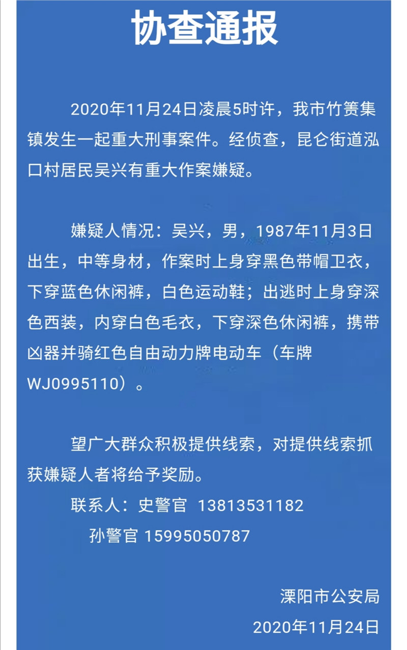 (記者 葛小林)11月24日凌晨5時許,溧陽竹簀集鎮(zhèn)一浴場會所發(fā)生重大刑事案件,有人員死傷,行兇嫌疑人逃亡。溧陽警方發(fā)布協(xié)查通報,希望市民積極提供線索。