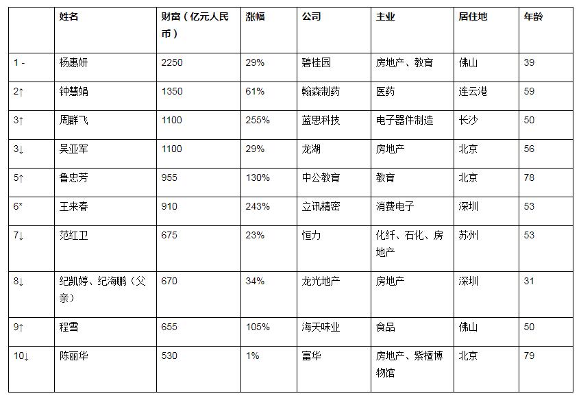 榜單顯示,前50名中國(guó)女企業(yè)家的總財(cái)富比去年增加近6000億,達(dá)到1.9萬(wàn)億,漲幅43%。今年發(fā)布的胡潤(rùn)百富榜上,女企業(yè)家占比從去年的27.2%下降至24.9%,其中六成是白手起家。今年上榜女富豪中,從事新興行業(yè)的比例比去年上漲四分之一,達(dá)到36%。先進(jìn)制造第一次超過(guò)房地產(chǎn),成為上榜女企業(yè)家最主要財(cái)富來(lái)源。不過(guò)碧桂園的楊惠妍財(cái)富增長(zhǎng)500億,仍然以2250億連續(xù)四年問(wèn)鼎中國(guó)女首富。