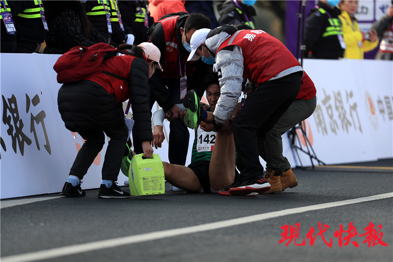 臨近終點,江蘇參賽選手楊樂因雙腿痙攣倒地,后咬牙堅持,重新站起,步履蹣跚地邁向終點。最終,楊樂拖著受傷的腿沖線后倒地。即使如此,他仍以2小時13分05秒的成績排列男子第8名。堅強的意志和偉大的拼搏精神,令全場觀眾動容,并向他致敬!