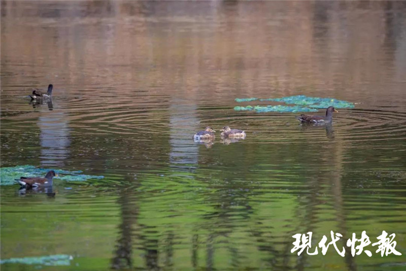 外形和鴨子一樣的䴙䴘比較常見(jiàn),全湖可見(jiàn)。它們比較膽小,常常在蘆葦叢中營(yíng)巢,或者成群在水上游蕩。通體黑褐色的黑水雞多在荷花種植區(qū)內(nèi)活動(dòng)。