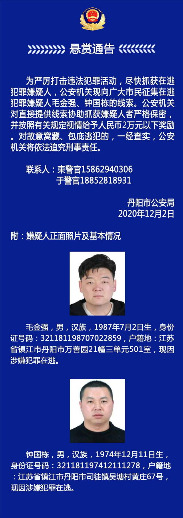 (通訊員 王丹 記者 曹德偉)12月2日,平安鎮(zhèn)江、丹陽(yáng)公安發(fā)布懸賞通告,征集兩名在逃犯罪嫌疑人毛金強(qiáng)、鐘國(guó)棟的線索,希望廣大市民能夠提供線索協(xié)助抓獲犯罪嫌疑人。公安機(jī)關(guān)對(duì)直接提供線索協(xié)助抓獲嫌疑人者將嚴(yán)格保密,并按照有關(guān)規(guī)定視情給予人民幣2萬(wàn)元以下獎(jiǎng)勵(lì)。對(duì)故意窩藏、包庇逃犯的,一經(jīng)查實(shí),公安機(jī)關(guān)將依法追究刑事責(zé)任。