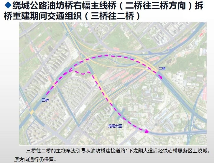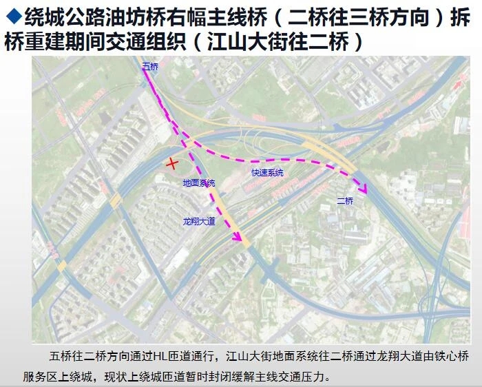 12月6日(本周日)下午,江山大街接龍翔路、機場二通道輔道接繞城公路匝道同時開通。同步封閉江山大街上繞城公路駛往二橋方向匝道。江山大街駛往二橋方向車流,避開5車道施工區(qū)域,由龍翔路--機場二通道地面輔道--繞城公路繞行。