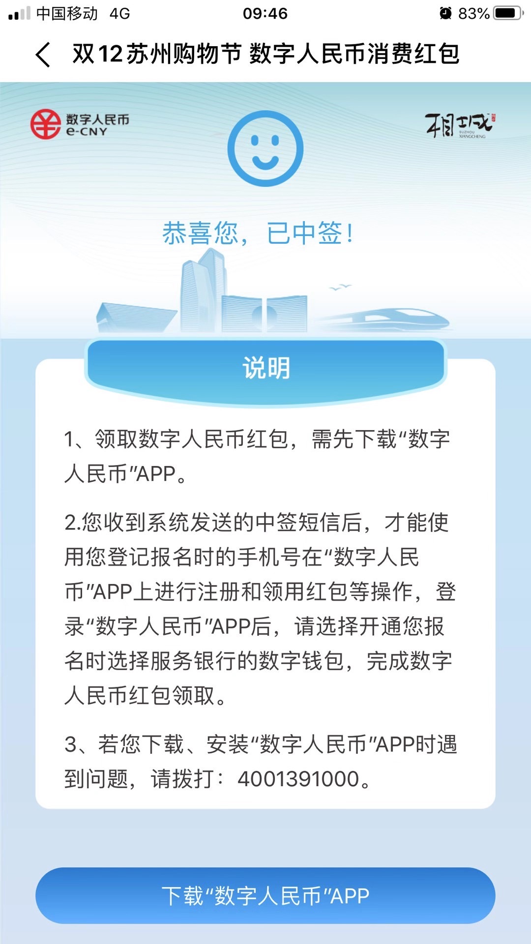 收到中簽短信或站內(nèi)信息后,中簽市民可登入“蘇周到”APP,根據(jù)指引下載安裝“數(shù)字人民幣APP”,也可去往所選擇銀行的網(wǎng)點,銀行網(wǎng)點將對無法自行安裝的市民提供安裝服務(wù)。