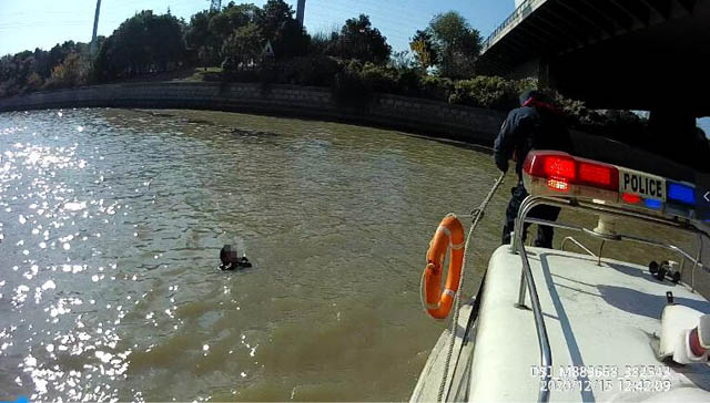 現(xiàn)代快報(bào)記者從常州交通部門了解到,12月15日中午,常州市交通運(yùn)輸綜合行政執(zhí)法支隊(duì)水上大隊(duì)二中隊(duì)執(zhí)法人員剛結(jié)束上午的巡航,正在吃著午飯。突然,從駐地邊上的村子里傳來(lái)一聲高喊:“快看,常金大橋上有人跳河!”話音剛落,一道黑色的人影快速越過(guò)護(hù)欄,墜入大運(yùn)河中。執(zhí)法人員扔下手中的盒飯,抓起救生衣套上,跳入摩托艇,調(diào)轉(zhuǎn)船頭直沖人員落水點(diǎn)。
