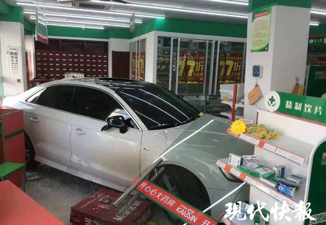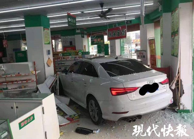 經(jīng)了解,駕駛奧迪車的是56歲的常熟本地男子王某某,其剛拿到駕駛證才2個月,尚處在實習(xí)期,車輛也是剛買不久。事發(fā)時,王某某在藥房門口準(zhǔn)備停車,本已放慢了速度,但在操作時錯將剎車當(dāng)成油門踩下,車輛直接撞碎玻璃門沖進(jìn)了藥房。好在藥房中央有個柱子,車輛在撞上柱子后停了下來。