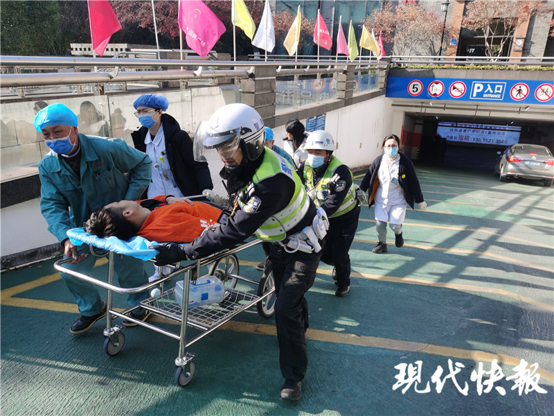 隨后,兩名民警立即奔跑進(jìn)市民手指的方向查看。民警發(fā)現(xiàn),一名年輕男子躺在車庫上下道的地上,沒有知覺,一名女子在邊上不停呼救。由于事發(fā)地點在地下,手機(jī)信號不好,民警一時也聯(lián)系不上醫(yī)院急救。民警便立即奔跑到中醫(yī)院急診,聯(lián)系了醫(yī)務(wù)人員。短短五分鐘,急診醫(yī)生就帶著擔(dān)架趕到現(xiàn)場,一群人立即將昏迷人員送往醫(yī)院急救。