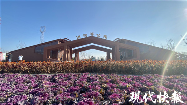 冬季蘇北平原寒風凜冽,大運河上船只往來,依然繁忙。宿遷運河灣公園里卻透著寧靜之美,天藍水清,各種常綠樹種生機盎然。這里曾是運河碼頭,周圍有玻璃廠、發(fā)電廠等舊廠房,環(huán)境并不理想。經(jīng)過改造升級,這里的面貌煥然一新,成了當?shù)氐木W(wǎng)紅景點。現(xiàn)代快報了解到,該公園是2019年開始建設,為當年宿遷大運河文化帶中心城市建設的一項重點工程,總投資約3億元,2020年9月30日開園。