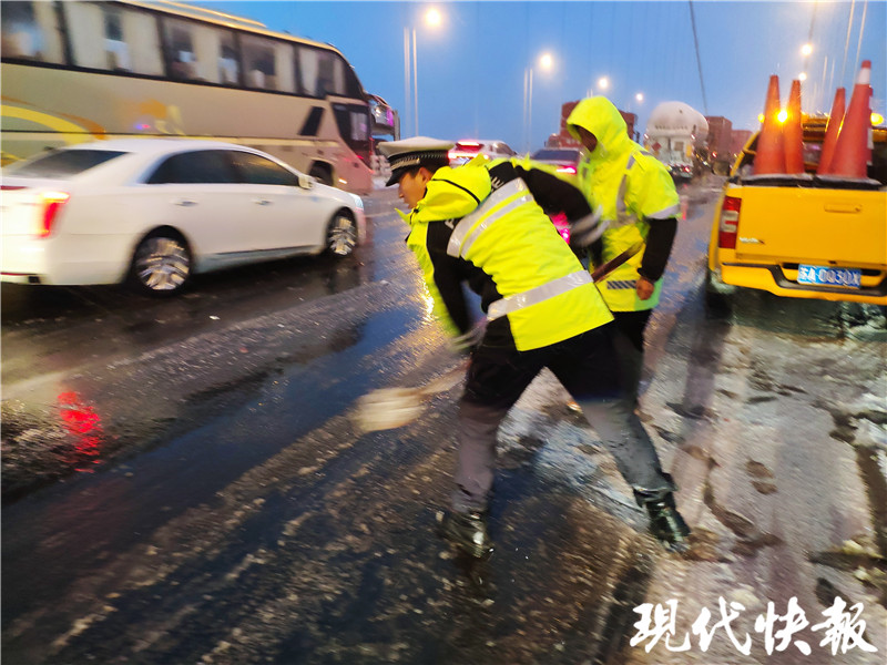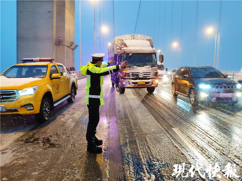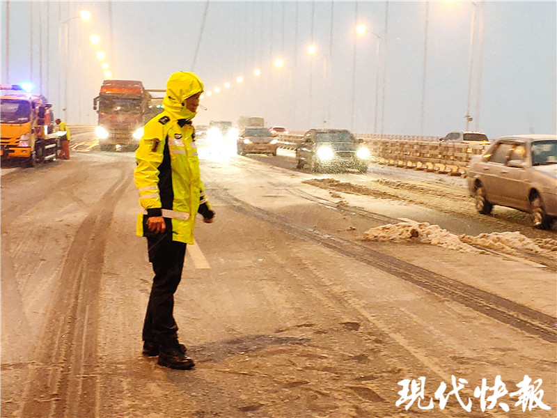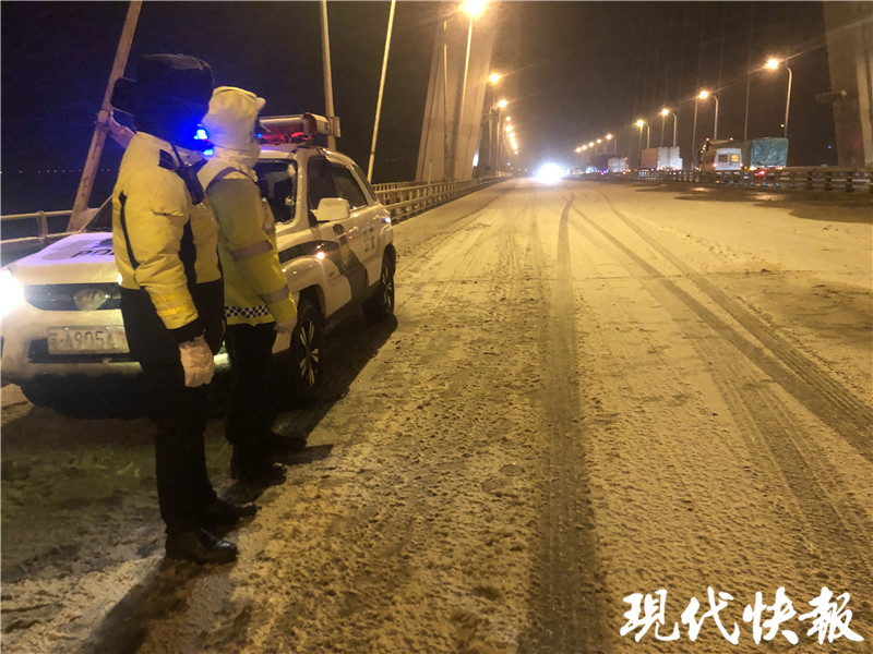 (通訊員 寧交軒 記者 王瑞)受寒潮影響,12月29日南京飄起了漫天大雪,部分路段尤其高速上已經(jīng)出現(xiàn)積雪。針對這一情況,南京交警已經(jīng)有序布撒融雪劑,同時(shí)為防止降溫后路面結(jié)冰,目前高速路段鏟雪車已經(jīng)“上線”。此外,為確保車輛出行安全,像南京棲霞山長江大橋、大勝關(guān)長江大橋等,因橋面積雪較多,交警已經(jīng)站在橋面疏導(dǎo)交通;南京江心洲大橋已開啟爆閃燈提醒過往車輛注意安全。