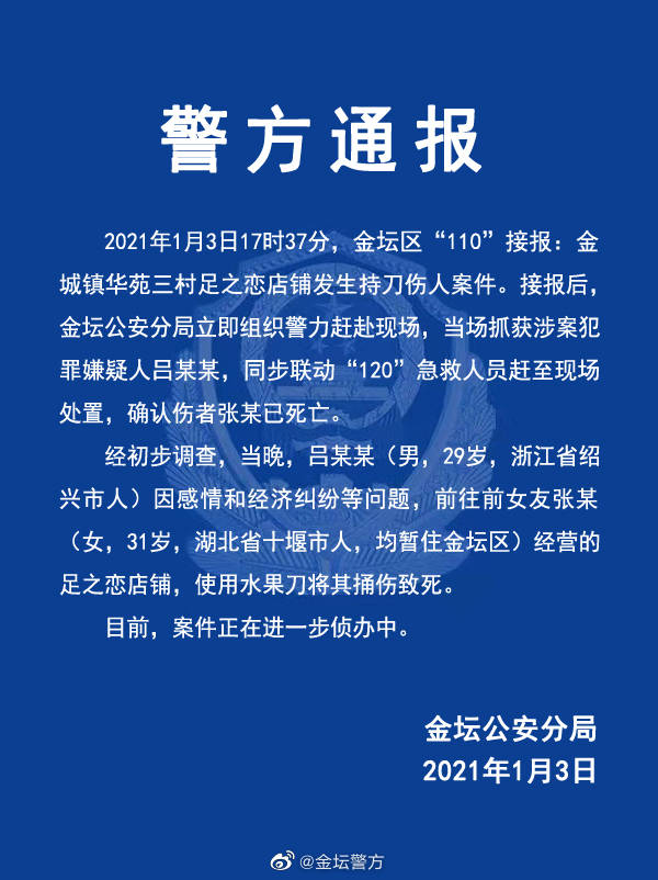 通報(bào)稱:2021年1月3日17時(shí)37分,金壇區(qū)110接報(bào):金城鎮(zhèn)華苑三村足之戀店鋪發(fā)生持刀傷人案件。接報(bào)后,金壇公安分局立即組織警力趕赴現(xiàn)場(chǎng),當(dāng)場(chǎng)抓獲涉案犯罪嫌疑人呂某某,同步聯(lián)動(dòng)“120” 急救人員趕至現(xiàn)場(chǎng)處置,確認(rèn)傷者張某已死亡。