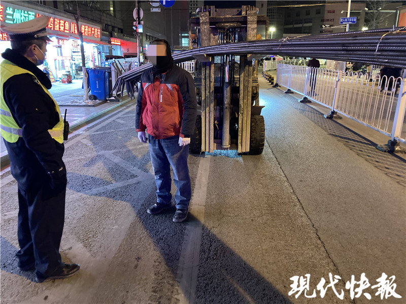 當天晚上10點多鐘,在徐州市復興南路上,叉車“舉著”6米長的一捆鋼筋在機動車道上行駛,鋼筋顫顫悠悠,十分危險。徐州鼓樓交警大隊五中隊的民警巡邏發(fā)現(xiàn)后,立即在復興北路上將其攔下,避免了交通事故的發(fā)生。