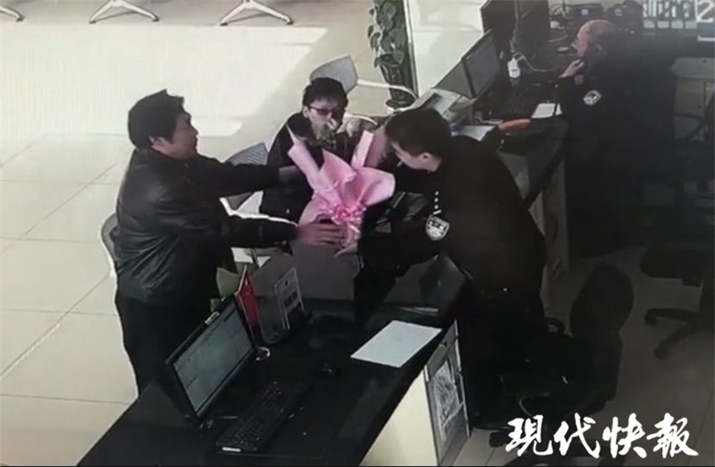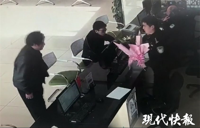 現(xiàn)代快報記者了解到,這感人一幕,被大廳的公共視頻全程記錄了下來。當(dāng)天上午11時30分許,虹橋派出所接待大廳,正在窗口解答群眾咨詢的副所長黃鵬看到,一名50多歲的男子手捧一束鮮花走了進(jìn)來。