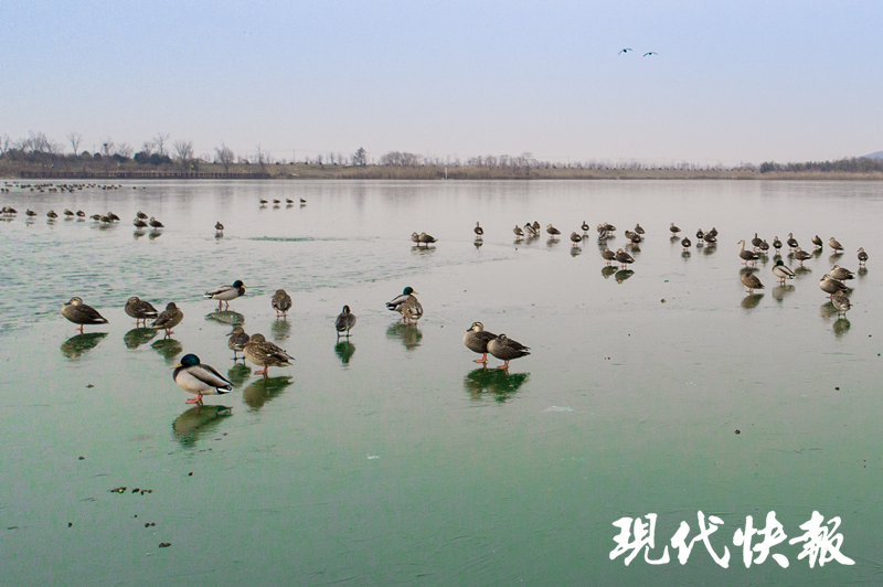 專家表示,每年10月至來年3月,都會有數(shù)萬只野生鳥類在赤山湖濕地越冬。赤山湖位于長江中下游地區(qū),像這樣大范圍結(jié)冰的情況并不多見,對于這些越冬的鳥類是一種嚴(yán)苛的生存挑戰(zhàn)。