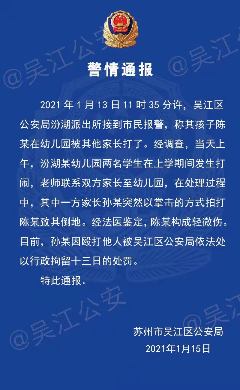 (記者 高達(dá))1月15日下午,蘇州市吳江區(qū)公安局發(fā)布警情通報。通報稱,2021年1月13日11時35分許,吳江區(qū)公安局汾湖派出所接到市民報警,稱其孩子陳某在幼兒園被其他家長打了。經(jīng)調(diào)查,當(dāng)天上午,汾湖某幼兒園兩名學(xué)生在上學(xué)期間發(fā)生打鬧,老師聯(lián)系雙方家長至幼兒園,在處理過程中,其中一方家長孫某突然以掌擊的方式拍打陳某致其倒地。經(jīng)法醫(yī)鑒定,陳某構(gòu)成輕微傷。目前,孫某因毆打他人被吳江區(qū)公安局依法處以行政拘留十三日的處罰。