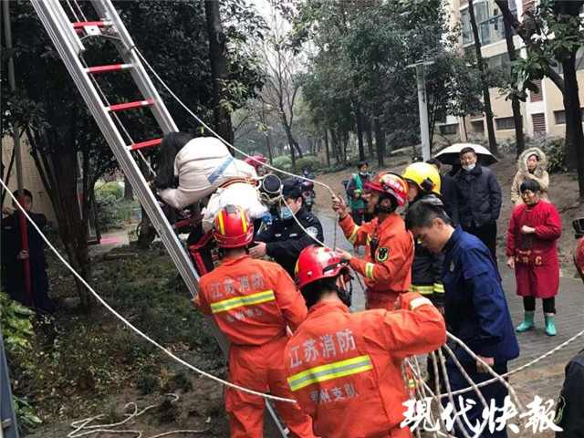2分鐘后,女孩堅持不住,一只手從窗臺邊滑落,幸虧此時消防員正好趕到現(xiàn)場,立刻搭起云梯靠近女孩,最終用安全繩綁住女孩送到平地上。