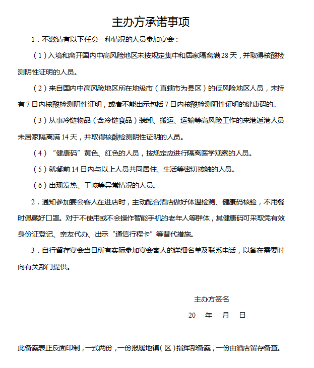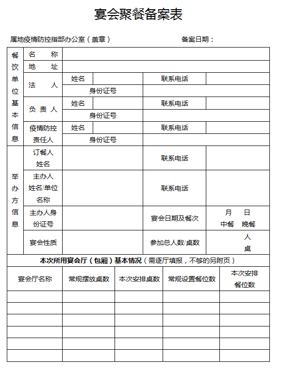 2.餐飲服務企業(yè)要盡量提前報備,最晚在酒宴舉辦前一天向酒店所在屬地指揮部指定部門和工作人員提交備案表。