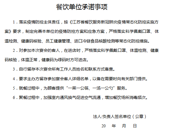 方案明確要求,即日起從事餐飲服務的企業(yè)單位,在接待超過50人的宴會聚餐時要進行提前備案(包含不在餐飲場所舉辦的,但由市民聘請廚師加工制作的自辦宴會)。各餐飲企業(yè)要按照《江蘇省餐飲服務新冠肺炎疫情常態(tài)化防控實施方案》(由屬地提供),根據(jù)自身情況,制定切實可行的疫情防控方案,加強日常訂餐、接待的信息登記臺賬,以便在發(fā)生情況時可追溯。