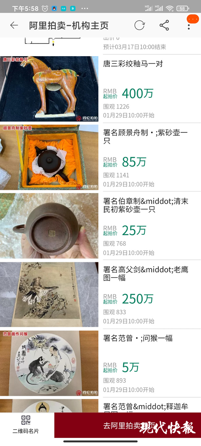 “這批拍賣品上架后,不少人設置了提醒,但是目前還沒有人現(xiàn)場來看。”院方告訴記者,本次拍賣的競價時間為1月29日上午10點至1月30日上午10點止,截至目前已有25人設置提醒,1217次圍觀。院方特別提醒,標的物要以實物看樣為準,法院不負責鑒定拍品真?zhèn)危怀袚Υ眉罢鎮(zhèn)伪WC。
