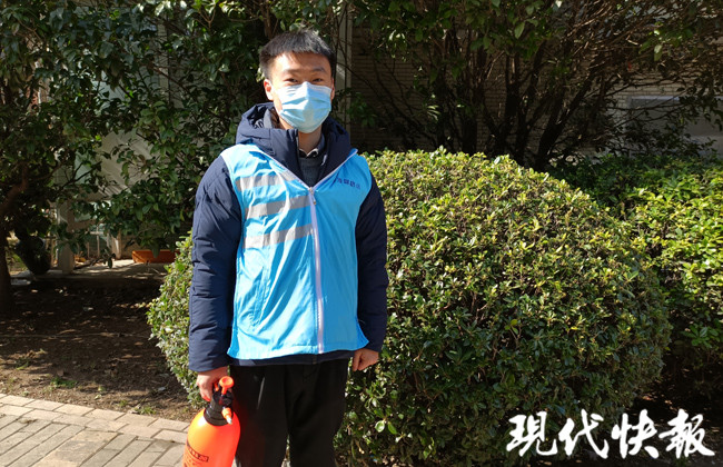 戴好一次性手套和口罩,來到居民家門口,首先對擺放在門邊的兩大袋垃圾進(jìn)行消殺,門口、墻角每個角落都沒有放過,消殺結(jié)束后提著垃圾離開。這樣的一套流程,倪彩文每天都要重復(fù)兩遍。