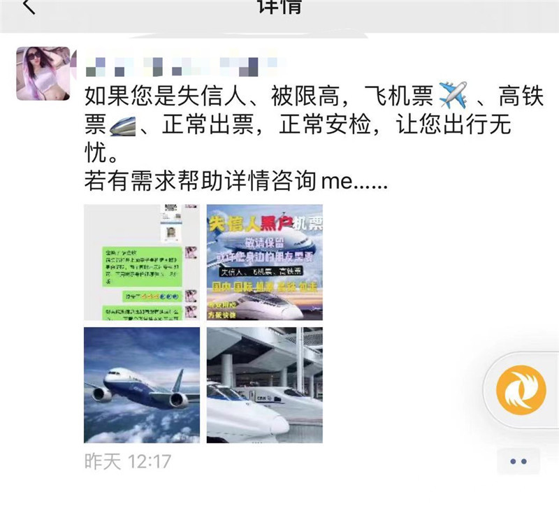 (記者 張瑾 陳子秋/文)“只要給錢,肯定能給你買到,每張加1100元手續(xù)費(fèi)。”近日,被媒體曝光有黃牛從事給失信人買機(jī)票業(yè)務(wù)后,雖然多家聊天平臺都加強(qiáng)了監(jiān)管,一些個人及群名帶明顯“老賴代購”等標(biāo)識的賬號基本都被強(qiáng)制注銷,但現(xiàn)代快報記者發(fā)現(xiàn)仍有一些黃牛潛伏,只不過披上了一層“馬甲”。記者連日調(diào)查發(fā)現(xiàn),輸入“機(jī)票代購、火車票出售”等詞匯,依然可以找到這些“黃牛”,這些黃牛宣稱有自己開發(fā)的境外系統(tǒng),可以躲避國內(nèi)征信系統(tǒng)的監(jiān)查,確保順利出票。其中有位黃牛聲稱,疫情期間,順利幫一位“老賴”從國外回國。
