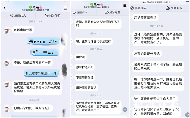 記者向黃牛詢問購票流程,黃牛聲稱是走境外渠道買,“國內(nèi)有征信系統(tǒng),只能走國外,我們有自己的系統(tǒng)。”但當(dāng)問及具體是什么方式時,黃牛叫記者不要多問。一位黃牛告訴記者,身份證是肯定買不了的,但是可以通過護(hù)照購買。因為護(hù)照信息沒有列入征信系統(tǒng),但究竟能不能登機(jī)成功,還是要看機(jī)場查得嚴(yán)不嚴(yán)。“今年查的嚴(yán),再加上疫情的原因,國內(nèi)的幾乎沒走過,不知道哪個機(jī)場風(fēng)險小,無法幫你規(guī)避風(fēng)險。”