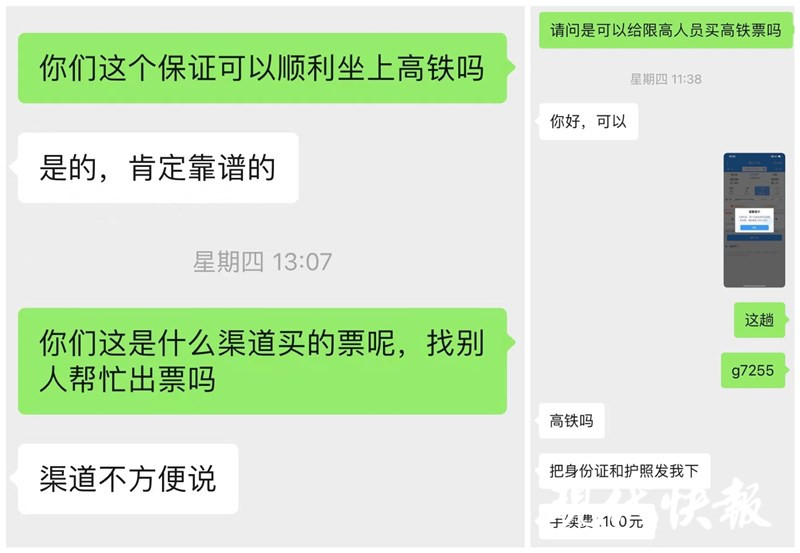 不到半小時,這位群主便回復(fù)記者可以購買機(jī)票,加上手續(xù)費(fèi)一共需要2401元。記者詢問為何自己在飛豬等平臺看只需600元左右的機(jī)票,群主告訴記者,有手續(xù)費(fèi)也有涉及到稅率造成的差價等。記者將這位限高人員的身份證信息提供給另一位黃牛,咨詢是否能幫忙購買高鐵票。這位黃牛告訴記者沒問題,只不過需要加1100元的手續(xù)費(fèi)。“代買高鐵票的話,不管原價多少手續(xù)費(fèi)都是固定的1100元,代買機(jī)票的話,手續(xù)費(fèi)還會更高一些。”