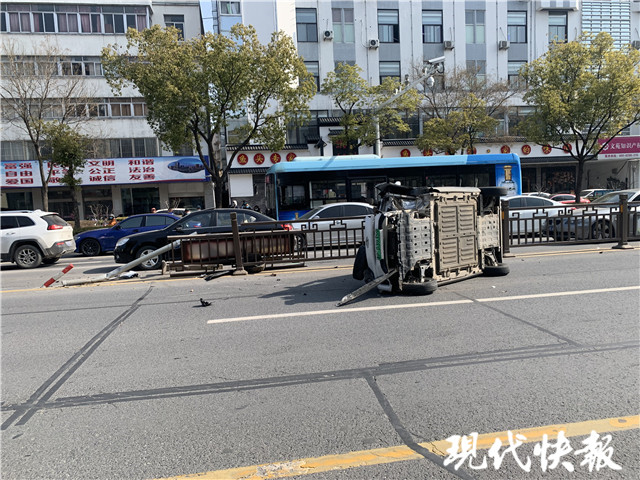 1月30日上午11時(shí)50分許,在揚(yáng)州市揚(yáng)子江路揚(yáng)州中級(jí)人民法院附近路段發(fā)生一起交通事故,一輛白色的轎車側(cè)翻在機(jī)動(dòng)車道上,安全氣囊全部彈出。事故現(xiàn)場(chǎng)一片狼藉,道路中間的標(biāo)志牌被撞倒,多節(jié)隔離護(hù)欄被撞壞。