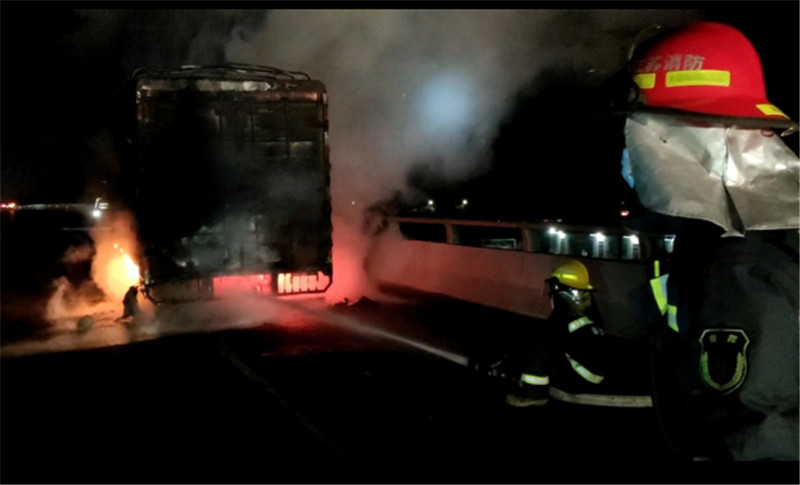 接到報警后,礦山路消防救援站趕赴現(xiàn)場處置。消防員到達現(xiàn)場后,發(fā)現(xiàn)高速公路養(yǎng)護人員已經(jīng)到場做好警戒,車廂部位已被大火包圍,火勢正在威脅油箱和車頭,高速路邊的草坪也被引燃。