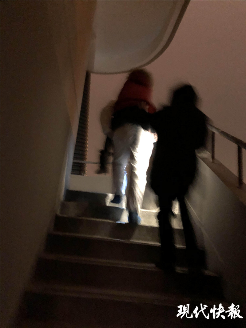 一番推辭下,田野慢慢將邵女士托起,由其丈夫負責照明和攙扶,就這樣一步步將她背上了5樓,“說實話,真的從來沒感覺到爬樓這么累的,因為身上穿著防護服,手腳也伸展不開,到了5樓就實在沒力氣了。”田野告訴記者,邵女士所住房間在6樓,到了5樓后,還剩最后一層,幾人便攙著邵女士,慢慢爬了上去。到達隔離房間安頓好后,夫妻二人連聲感謝。