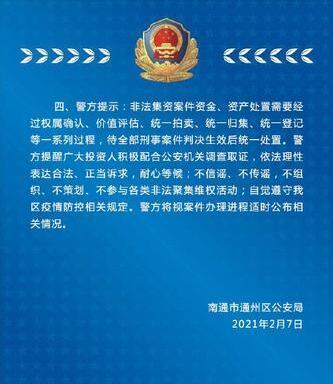 四、警方提示:非法集資案件資金、資產(chǎn)處置需要經(jīng)過權(quán)屬確認(rèn)、價值評估、統(tǒng)一拍賣、統(tǒng)一歸集、統(tǒng)一登記等一系列過程,待全部刑事案件判決生效后統(tǒng)一處置。警方提醒廣大投資人積極配合公安機(jī)關(guān)調(diào)查取證,依法理性表達(dá)合法、正當(dāng)訴求,耐心等候;不信謠、不傳謠,不組織、不策劃、不參與各類非法聚集維權(quán)活動;自覺遵守通州區(qū)疫情防控相關(guān)規(guī)定。警方將視案件辦理進(jìn)程適時公布相關(guān)情況。