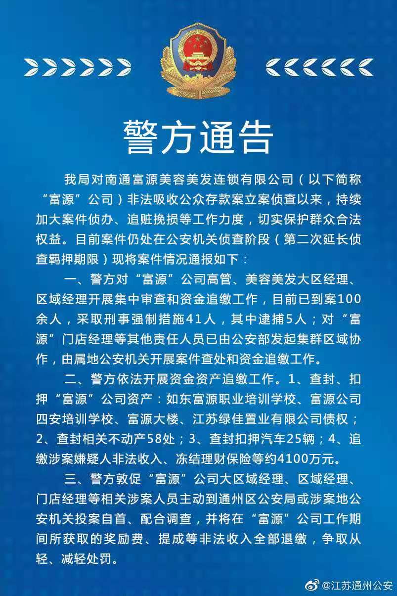 (記者 嚴(yán)君臣)2月7日,南通市通州區(qū)公安分局通過官方微博@江蘇通州公安 發(fā)布對南通富源美容美發(fā)連鎖有限公司(以下簡稱“富源”公司)非法吸收公眾存款案的偵查情況。通報內(nèi)容顯示,立案偵查以來,該局持續(xù)加大案件偵辦、追贓挽損等工作力度,切實(shí)保護(hù)群眾合法權(quán)益。目前案件仍處在公安機(jī)關(guān)偵查階段(第二次延長偵查羈押期限)現(xiàn)將案件情況通報如下: